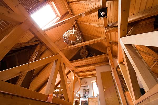 Um die schönen alten Balken wirken zu lassen, haben wir auf getrennte Räume verzichtet. Nur das Bad mit Dusche, WC und Waschbecken wurde selbstverständlich abgetrennt.